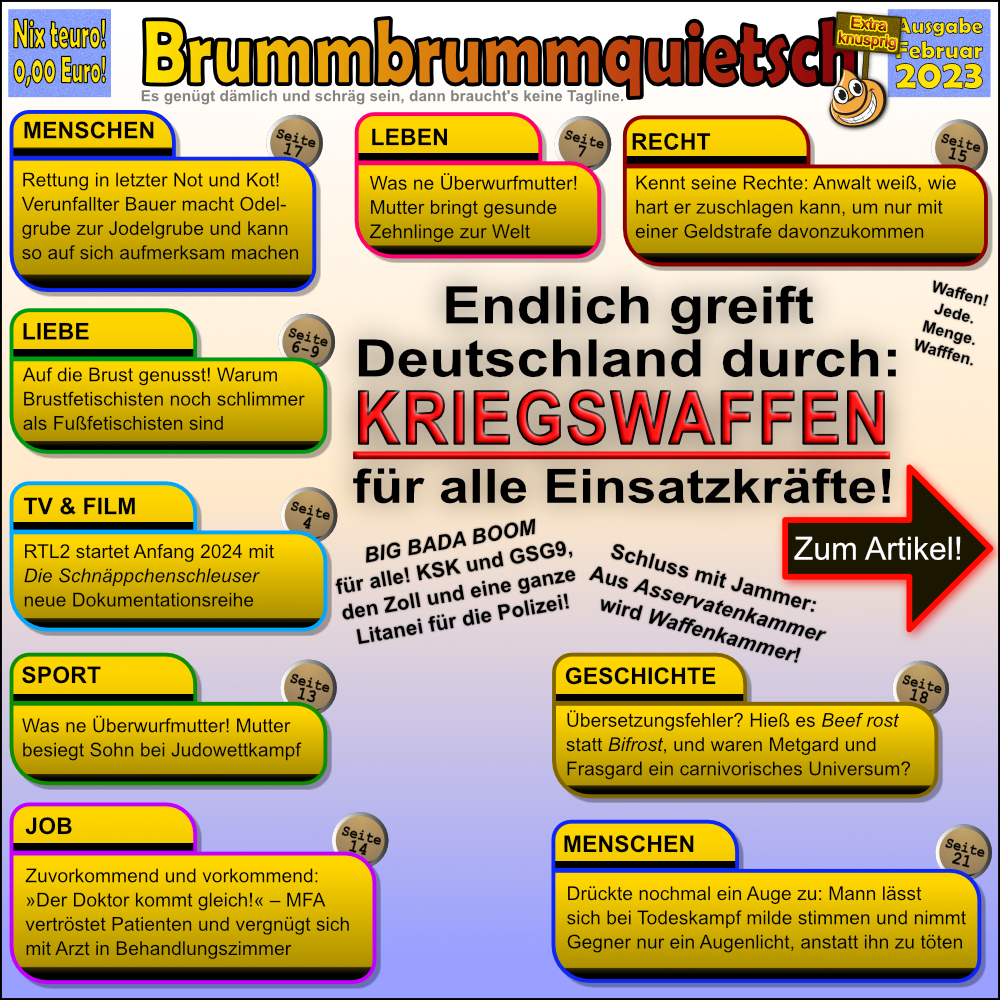 »Da wir mittlerweile amerikanische Verhältnisse haben und so Bürger mit besserem Arsenal aufwarten als Einsatzkräfte, ist es nötig, aufzurüsten. Es ist nicht akzeptabel, Polizisten mit schlichten Pistolen auszurüsten, während Reichsbürger mit Sturmgewehren auf sie schießen«, so ein Sprecher des Ministeriums.