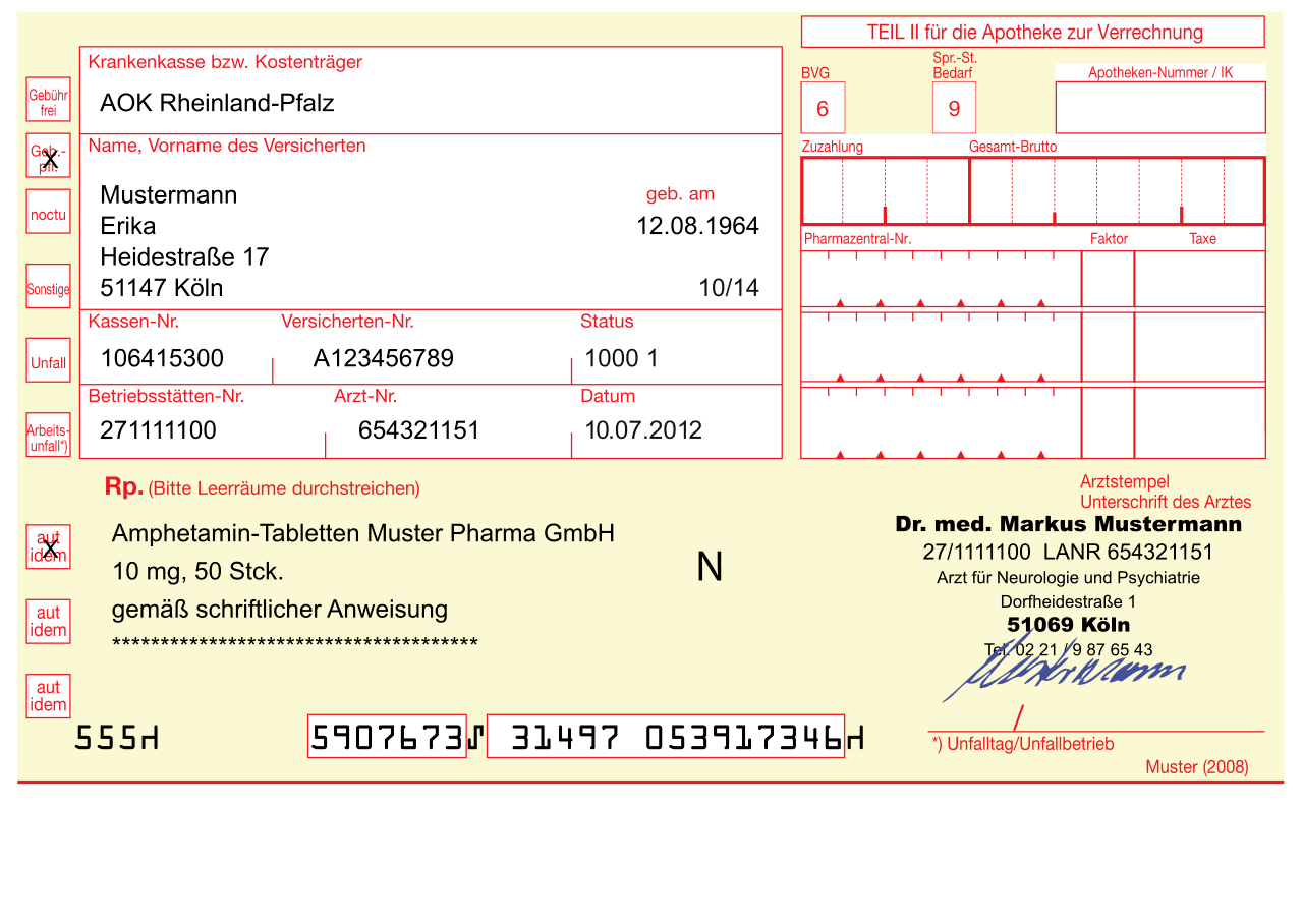 Beschreibung: Das Bild zeigt ein Betäubungsrezept, gelbes Formular mit roten Linien. Ausgefüllt ist es mit fiktiven Zahlen für eine Frau Erika Mustermann.
