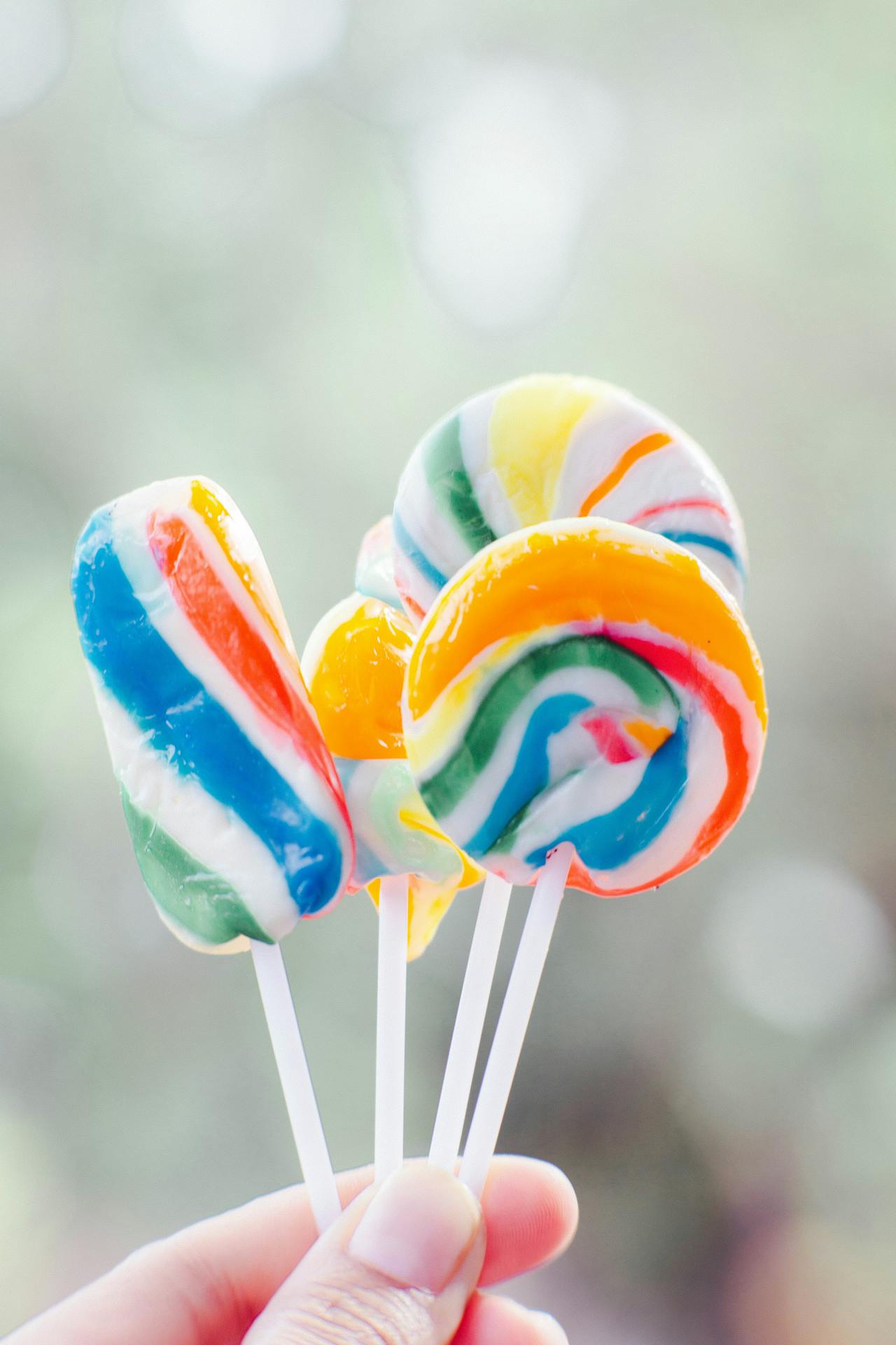 Eine Naheaufnahme von Fingern, die vier Dauerlutscher in bunten Farben halten.