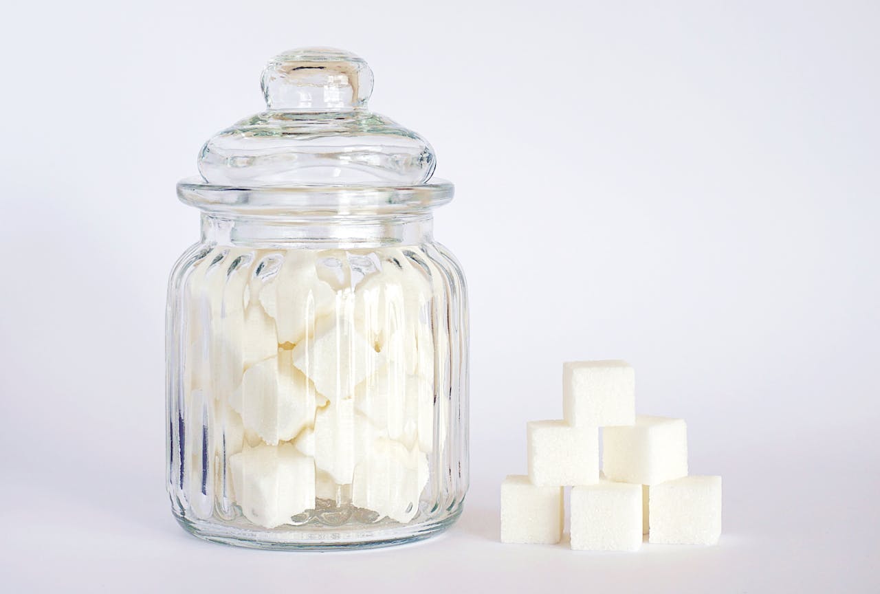Ein großes Glasgefäß mit Zuckerwürfel, daneben ein kleiner Stapel mit Würfelzucker.