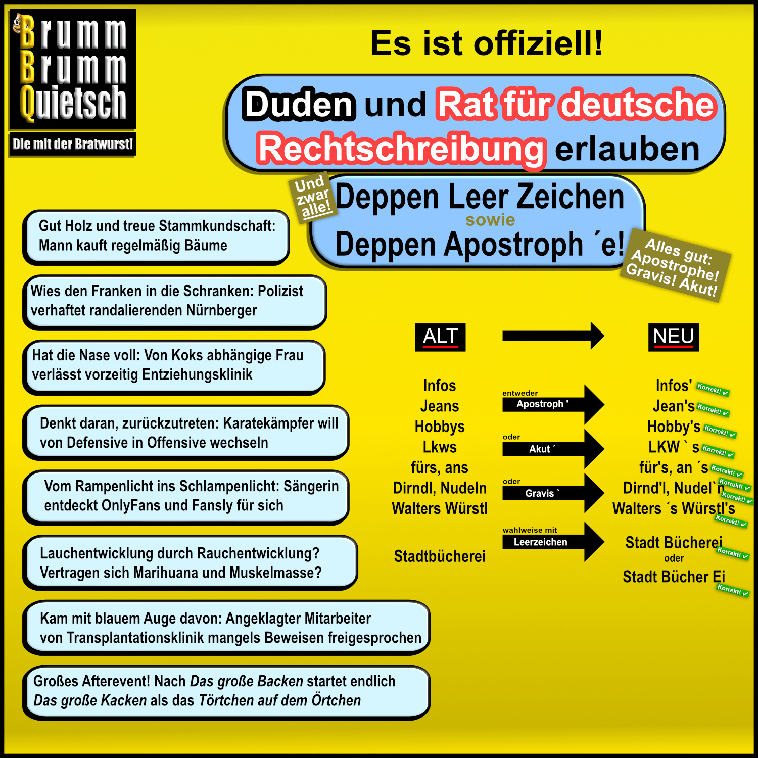Weiterhin war den Bazis von Gramatik Nazis der ganze Hick Hack mit dem Schnick Schnack schon lange nicht nur ein Dorn, sondern ein Horn im Auge, weiß man beim Rat für Recht Schreibung. »Deshalb entschied das Recht Schreib Rat Gremium, es weiter zu erleichtern: Apostroph, Akut und Gravis werden gleichgesetzt und jede Verwendung davon, selbst in Nicht-Komposita, al`s korrekt angesehen.«