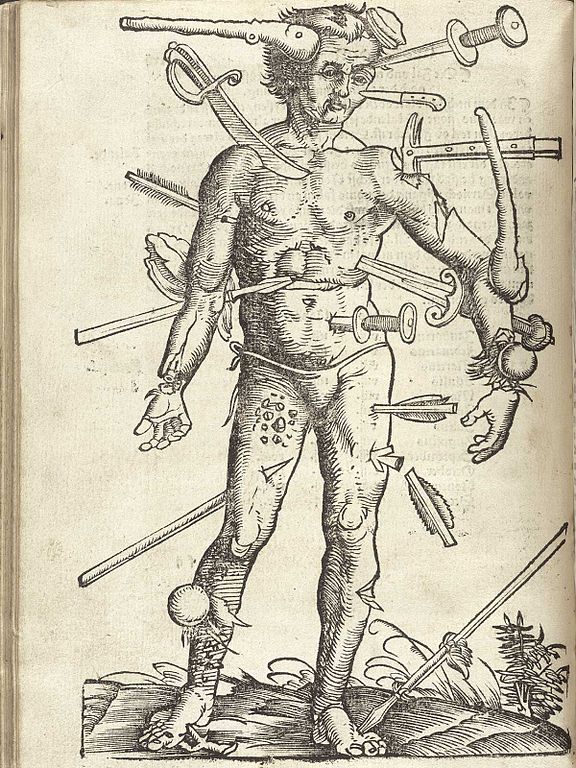 Der verwundete Mann. Feldtbůch der Wundartzney (Strasburg, 1528). ((Field book of surgery. The wounded man).
